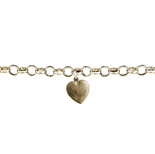 Een prachtig aandenken in de vorm van een elegant sieraad. Deze vingerafdrukarmband bestaat uit een mooie, smalle schakelarmband van goud met daaraan een hartvormige bedel. Deze hartjesbedel is driedimensionaal uitgewerkt en heeft hierdoor een mooie volle vorm. In deze zilveren bedel graveren wij met uiterste precisie een vingerafdruk, handpalmafdruk, afdruk van een dierenpootje of de afdruk van het voetje van uw baby. Hierdoor wordt deze toch al bijzondere armband een zeer persoonlijk en uniek aandenken aan uw geliefde of dierbare.