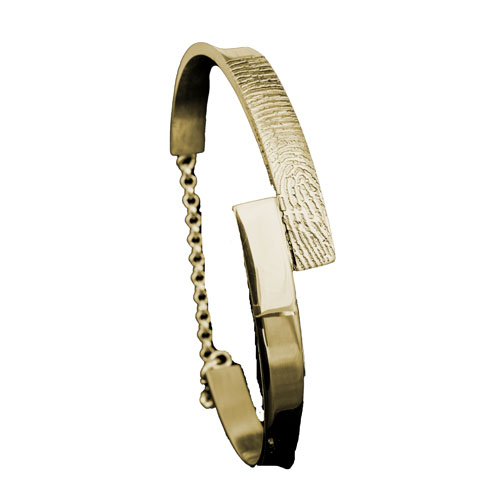 Sierlijke 14 karaat geelgouden open plaatarmband met een vingerafdruk in het midden van de armband.  Het is tevens mogelijk om een afdruk van een handpalm, dierenpoot, babyvoetje of babyhandje te laten graveren. Door de toevoeging van de afdruk wordt de armband een blijvende herinnering aan uw geliefde of dierbare. De plaatarmband is 2mm dik en is te bestellen in de breedtes 5mm en 7mm.