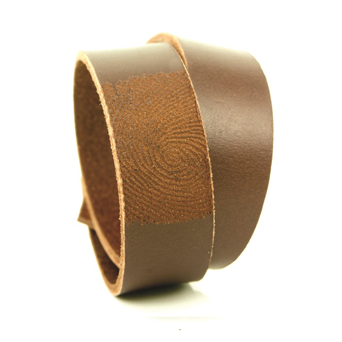 Deze vingeradruk armband is verkrijgbaar in de kleuren zwart, donkerbruin en bruin.