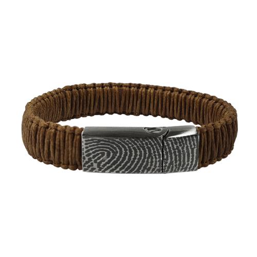 Mooie vingerafdruk armband met met askamer en cognac geknoopt leer. De RVS sluiting kunt u mat of glanzend laten afwerken. In de buitenkant van de sluiting wordt een vingerafdruk gegraveerd door middel van een laser. In de binnenkant van de sluiting kunt u een tekst laten graveren van maximaal 20 tekens.