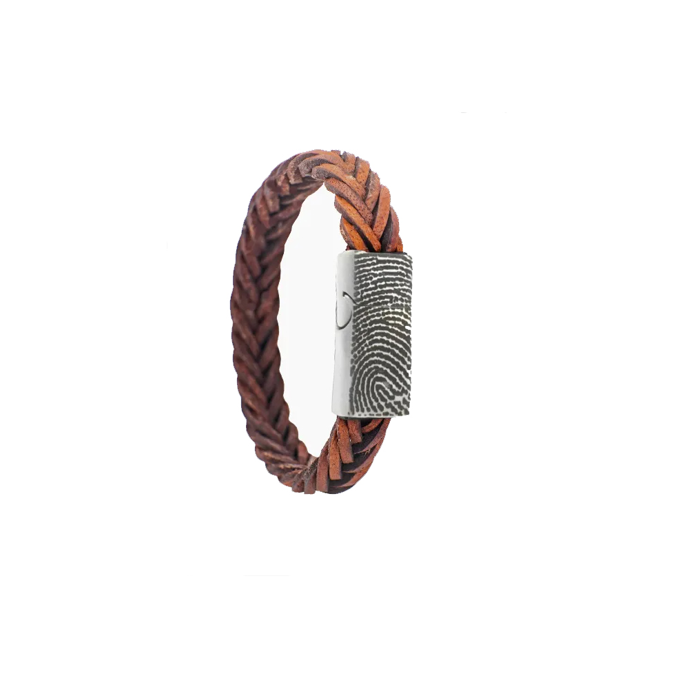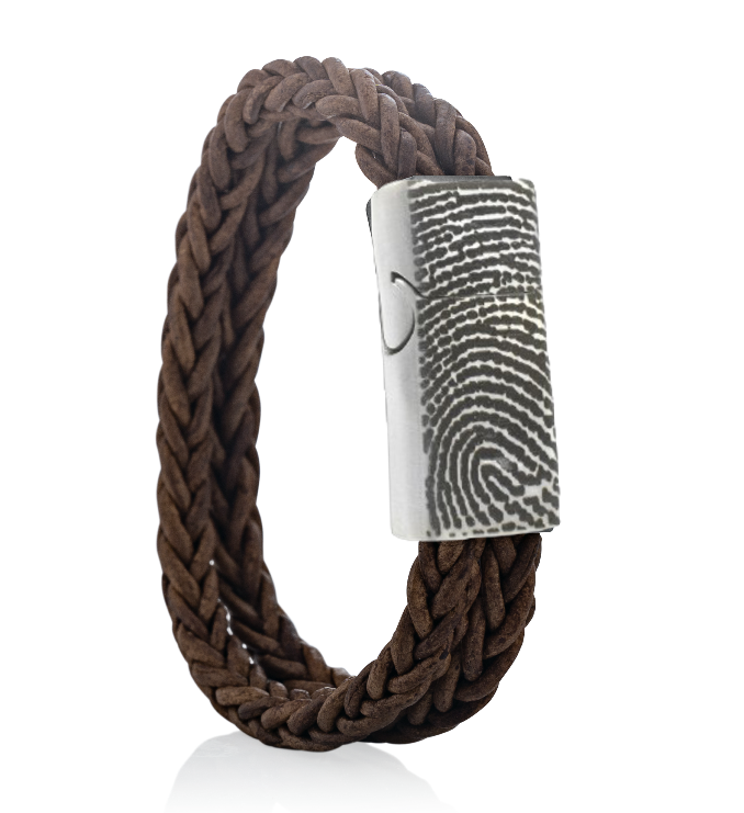 Leren armband met een enkele of dubbele gevlochten band en met een vingerafdruk in het slot van staal. Het leer van de armband is 12mm breed en de sluiting heeft een breedte van 14mm. De vingerafdruk graveren wij met een laser in het slot.