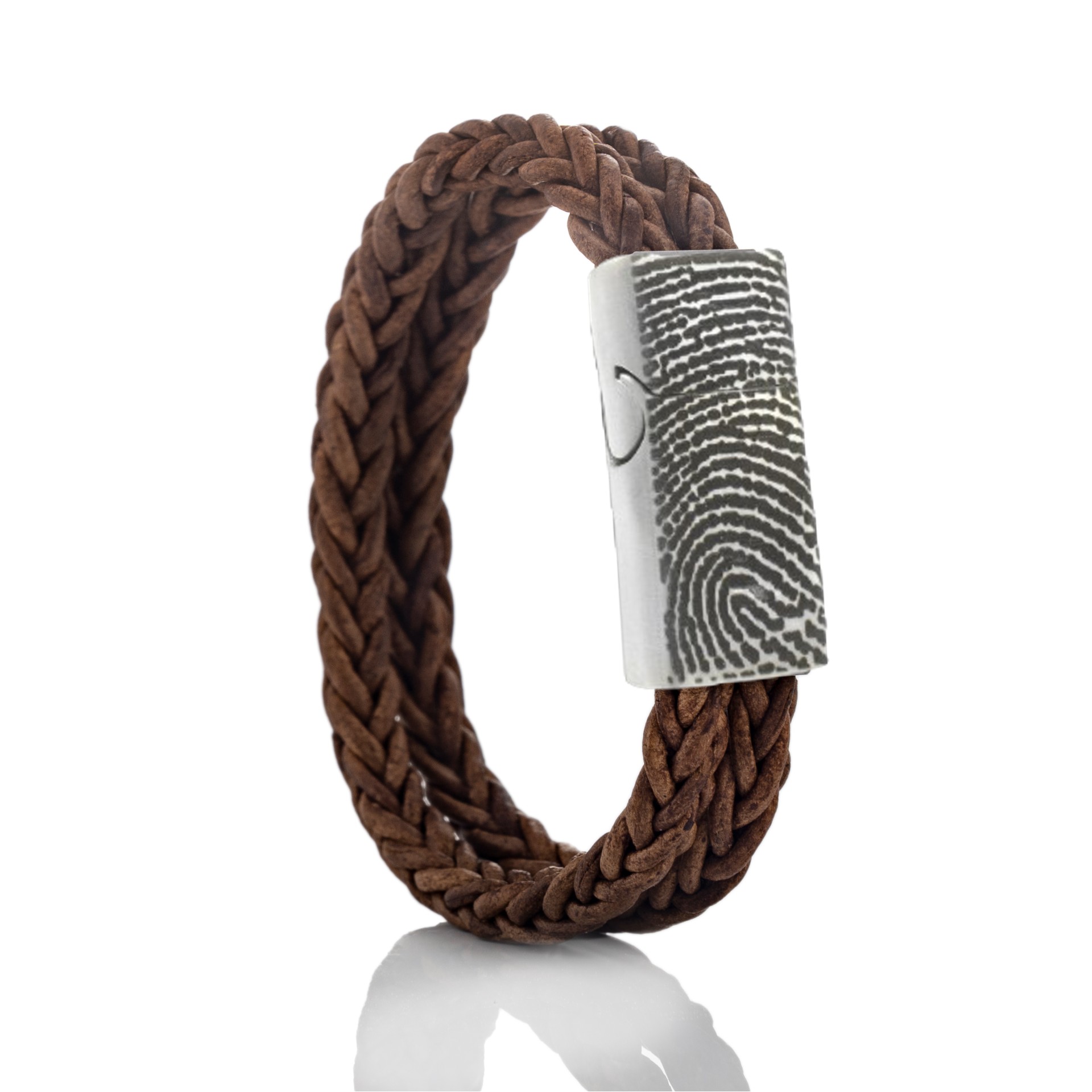Gevlochten leren armband met vingerafdruk in edelstalen magneetslot
