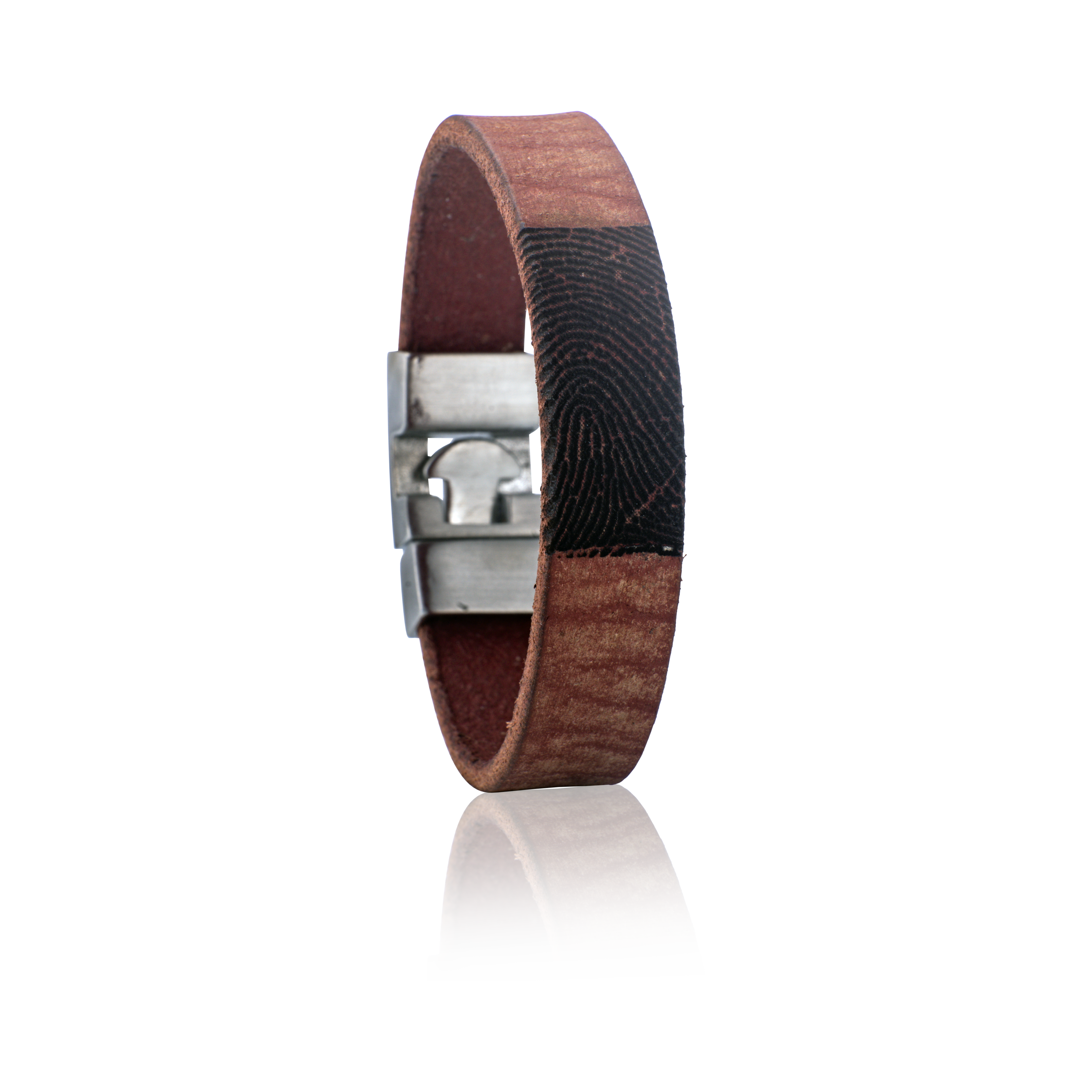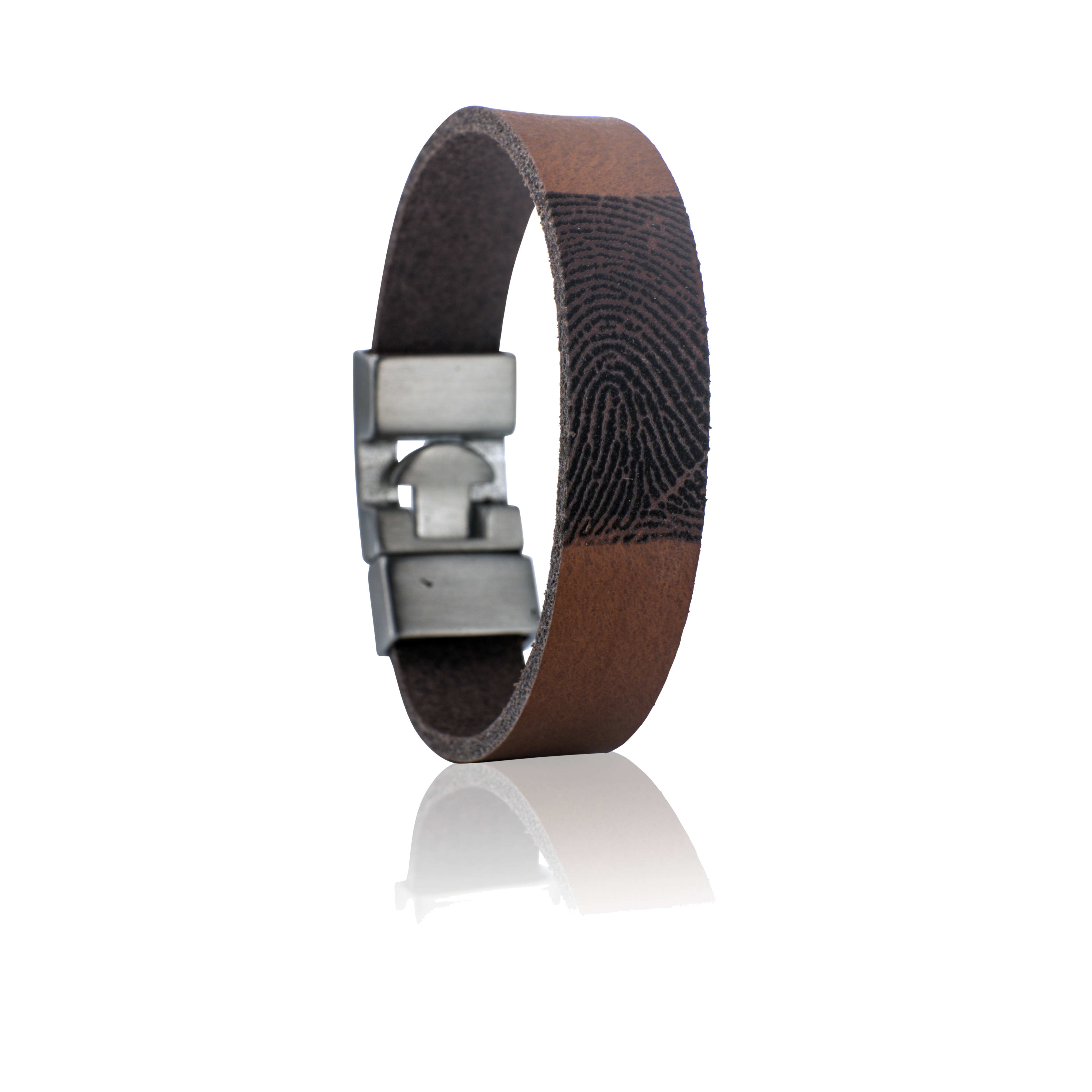 In deze smalle leren armband is de vingerafdruk met een laser gegraveerd in het leer. Het leer is 14mm breed en de sluiting heeft een breedte van 15.5mm. De armband wordt gesloten met een T-sluiting.