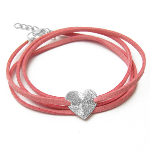 Suede wikkelarmband met een prachtige hartjes bedel waarin we een vingerafdruk van uw dierbare graveren. Het is ook mogelijk om twee afdrukken in het hartje te laten graveren. Het hartje is 18mm groot. De armband wikkelt diverse malen om de pols en is instelbaar door het sluitingskettinkje zodat deze armband altijd past. Deze armband is verkrijgbaar in de opvallende kleuren zwart, blauw en roze: