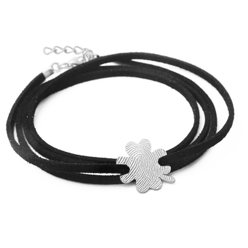 Suede wikkelarmband met een prachtige zilveren klaver bedel waarin we een vingerafdruk van uw dierbare graveren. Het is ook mogelijk om twee afdrukken in het klavertje te laten graveren. Het klavertje vier is 18mm groot. De armband wikkelt diverse malen om de pols en is instelbaar door het sluitingskettinkje zodat deze armband altijd past. Deze armband is verkrijgbaar in de opvallende kleuren zwart, blauw en roze:
