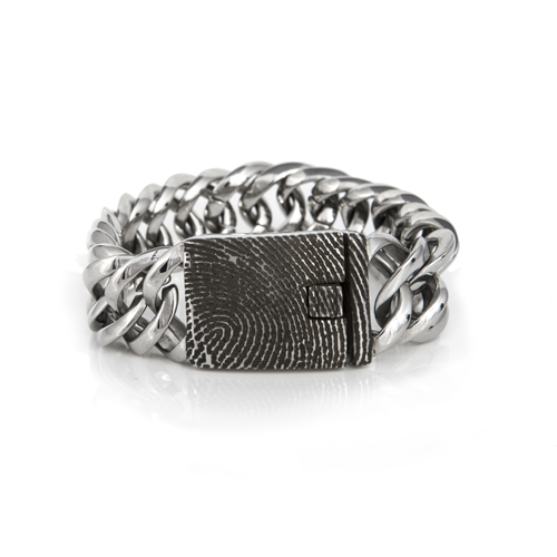 Deze armband met vingerafdruk is in diverse lengtes te bestellen, de sluiting is 26mm breed.