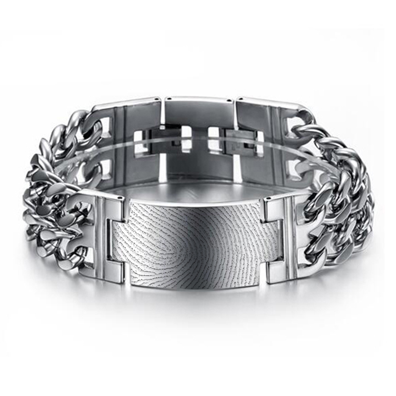 Stoere brede RVS armband met een lasergravure van een vingerafdruk. De vingerafdruk graveren wij door middel van een laser in de RVS plaat waardoor deze een subtiel uiterlijk krijgt.