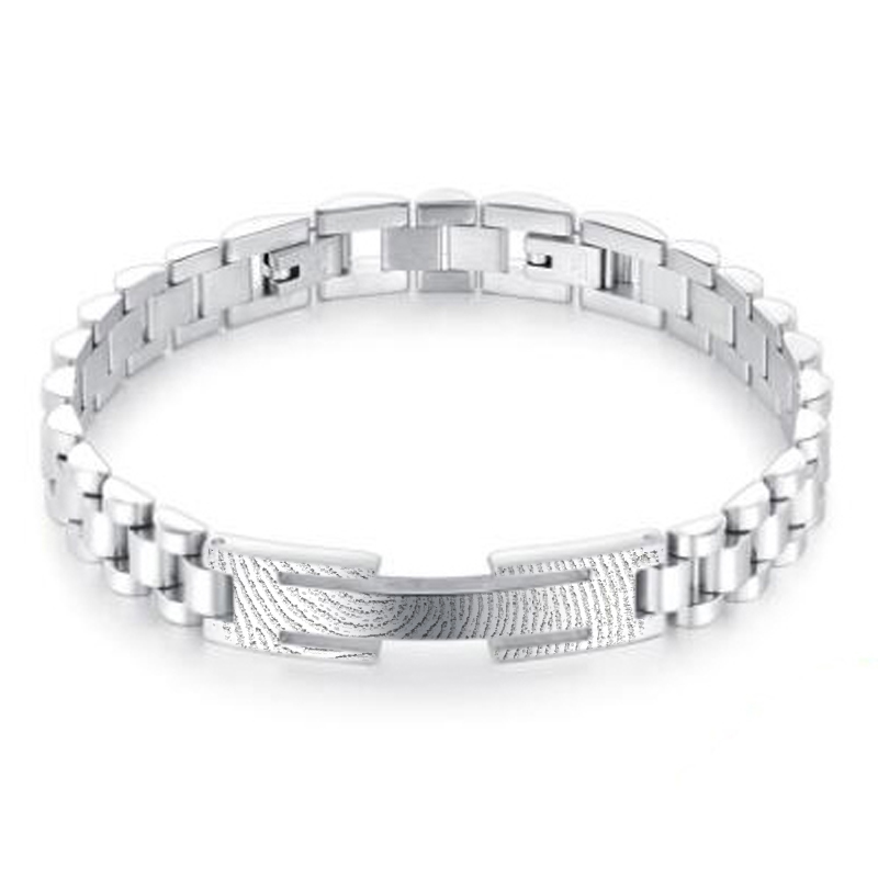 Edelstalen armband met een lasergravure van een vingerafdruk. De vingerafdruk graveren wij door middel van een laser in het edelstaal waardoor deze een elegant uiterlijk krijgt.