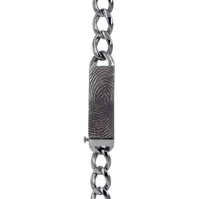 Stoere edelstalen armband met een lasergravure van een vingerafdruk. De vingerafdruk graveren wij door middel van een laser in het edelstaal waardoor deze een zwarte kleur krijgt.