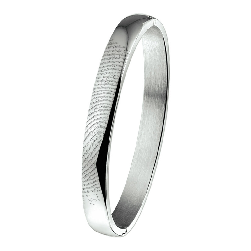 Deze RVS armband met vingerafdruk vormt een wel heel bijzondere manier om uw liefde uit te drukken. Op de scharnierarmband wordt met een laser een afbeelding van een vingerafdruk, handpalm, dierenpoot of babyhandje of –voetje gegraveerd. Door de toevoeging van de afdruk wordt de armband een blijvende herinnering aan een geliefde of dierbare.