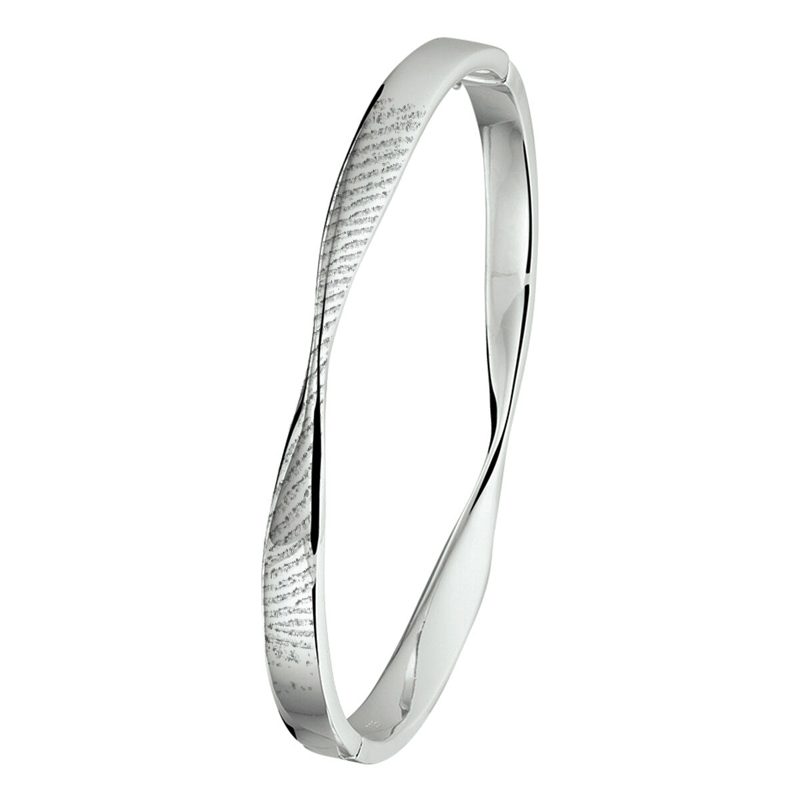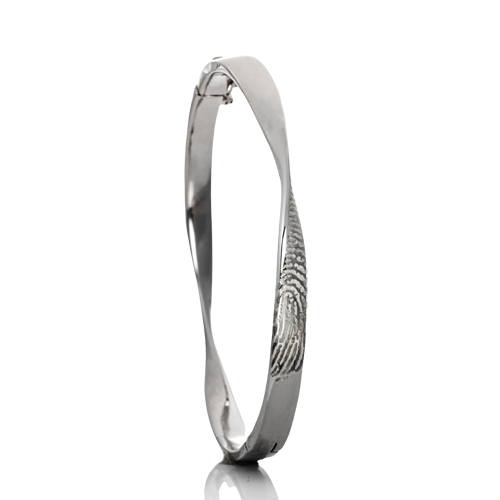 Deze gedraaide zilveren design armband met vingerafdruk vormt een heel bijzondere manier om uw liefde uit te drukken. Op de scharnierarmband wordt met een laser een afbeelding van een vingerafdruk, handpalm, dierenpoot of babyhandje of –voetje gegraveerd. Door de toevoeging van de afdruk wordt de armband een blijvende herinnering aan een geliefde of dierbare. De scharnierarmband is 58mm (ca. 16,5cm) groot en 5,5mm breed en sluit met een scharnier en klemslot. De armband kan mat of glanzend worden afgewerkt.