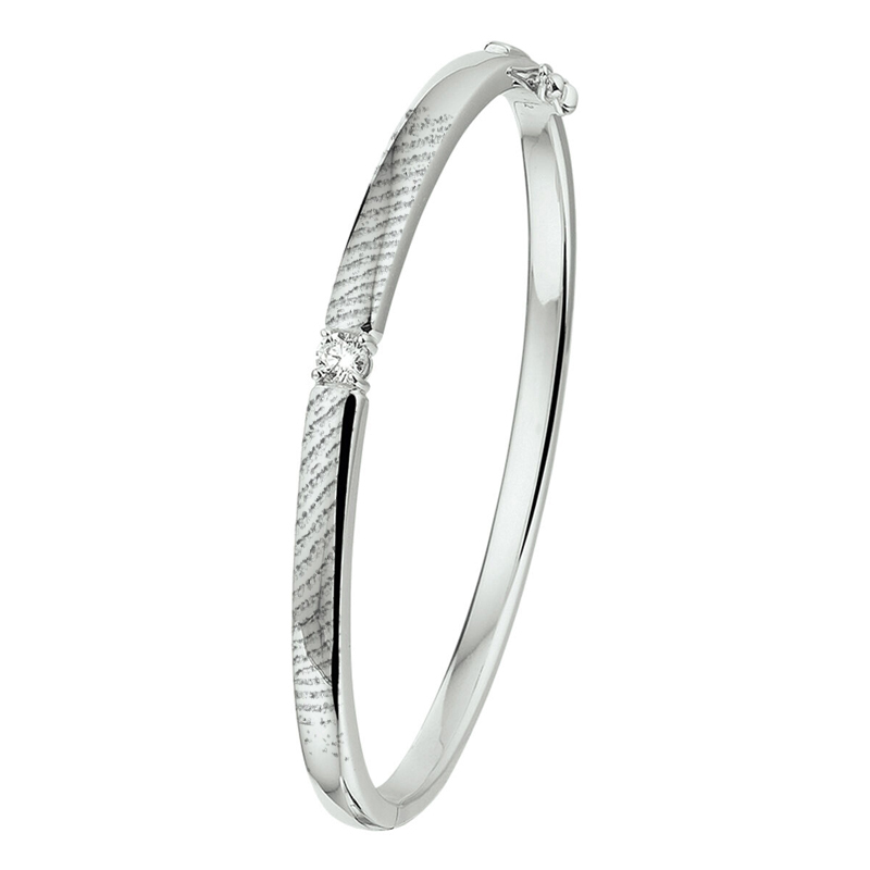 Deze smalle zilveren armband met vingerafdruk en een zirkonia steen, vormt een heel bijzondere manier om uw liefde uit te drukken. Op de scharnierarmband wordt met een laser een afbeelding van een vingerafdruk, handpalm, dierenpoot of babyhandje of –voetje gegraveerd. Door de toevoeging van de afdruk wordt de armband een blijvende herinnering aan een geliefde of dierbare. De scharnierarmband is 60mm (ca. 17cm) groot en 4,5mm breed en sluit met een scharnier en klemslot. De armband kan mat of glanzend worden afgewerkt.