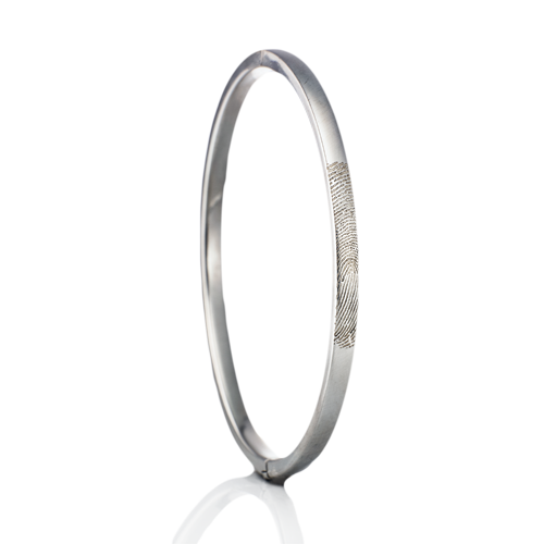 Deze smalle zilveren armband met vingerafdruk vormt een heel bijzondere manier om uw liefde uit te drukken. Op de scharnierarmband wordt met een laser een afbeelding van een vingerafdruk, handpalm, dierenpoot of babyhandje of –voetje gegraveerd. Door de toevoeging van de afdruk wordt de armband een blijvende herinnering aan een geliefde of dierbare. De scharnierarmband is 60mm (ca. 17cm) groot en 4mm breed en sluit met een bakslot. De armband kan mat of glanzend worden afgewerkt.