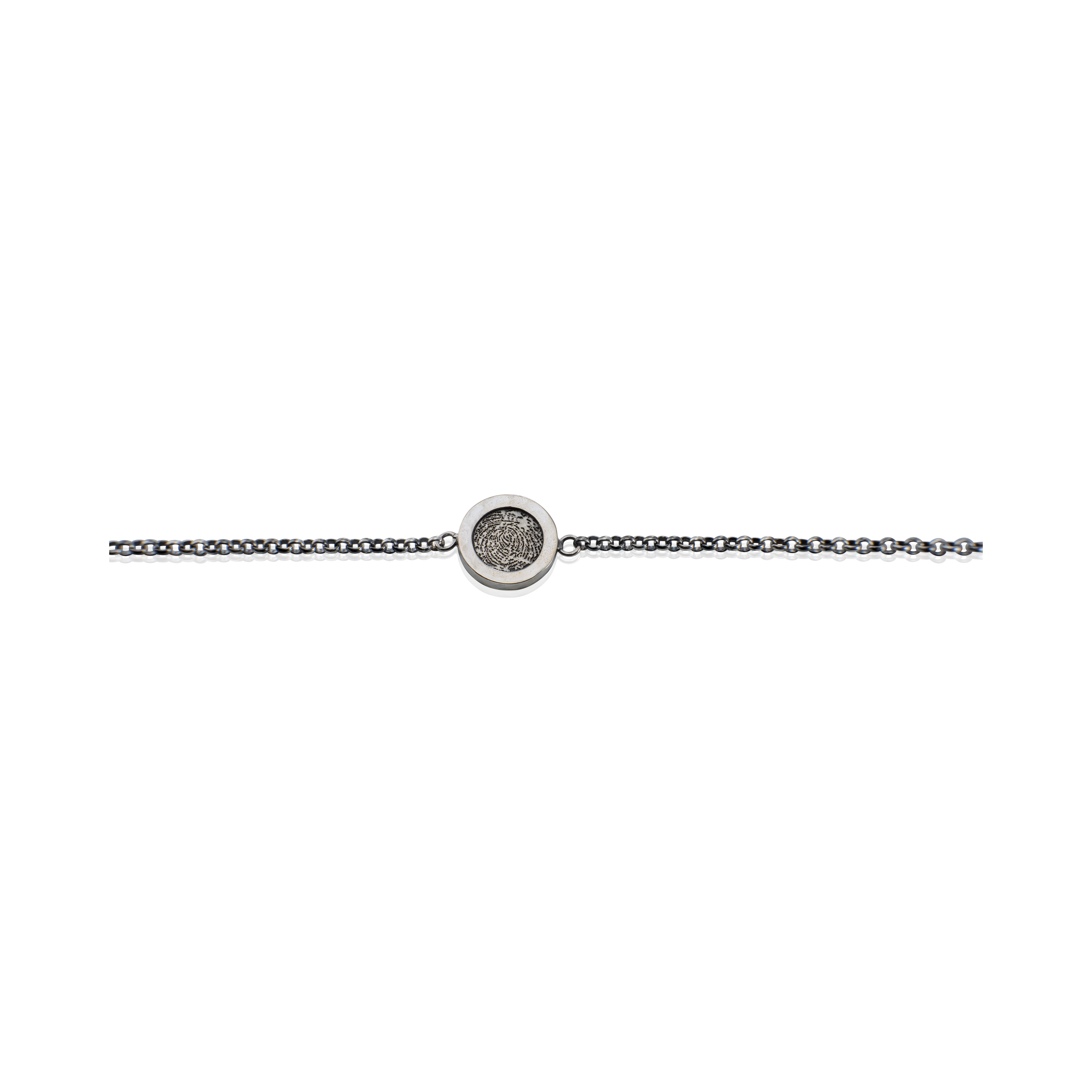 Zilveren vingerafdruk armband met vingerafdrukplaat. De armband heeft een jasseron schakel van 2.5mm breed. De ronde bedel heeft een totale afmeting van 14mm, waarbij de diameter van het vingerafdrukplaatje 10mm is.