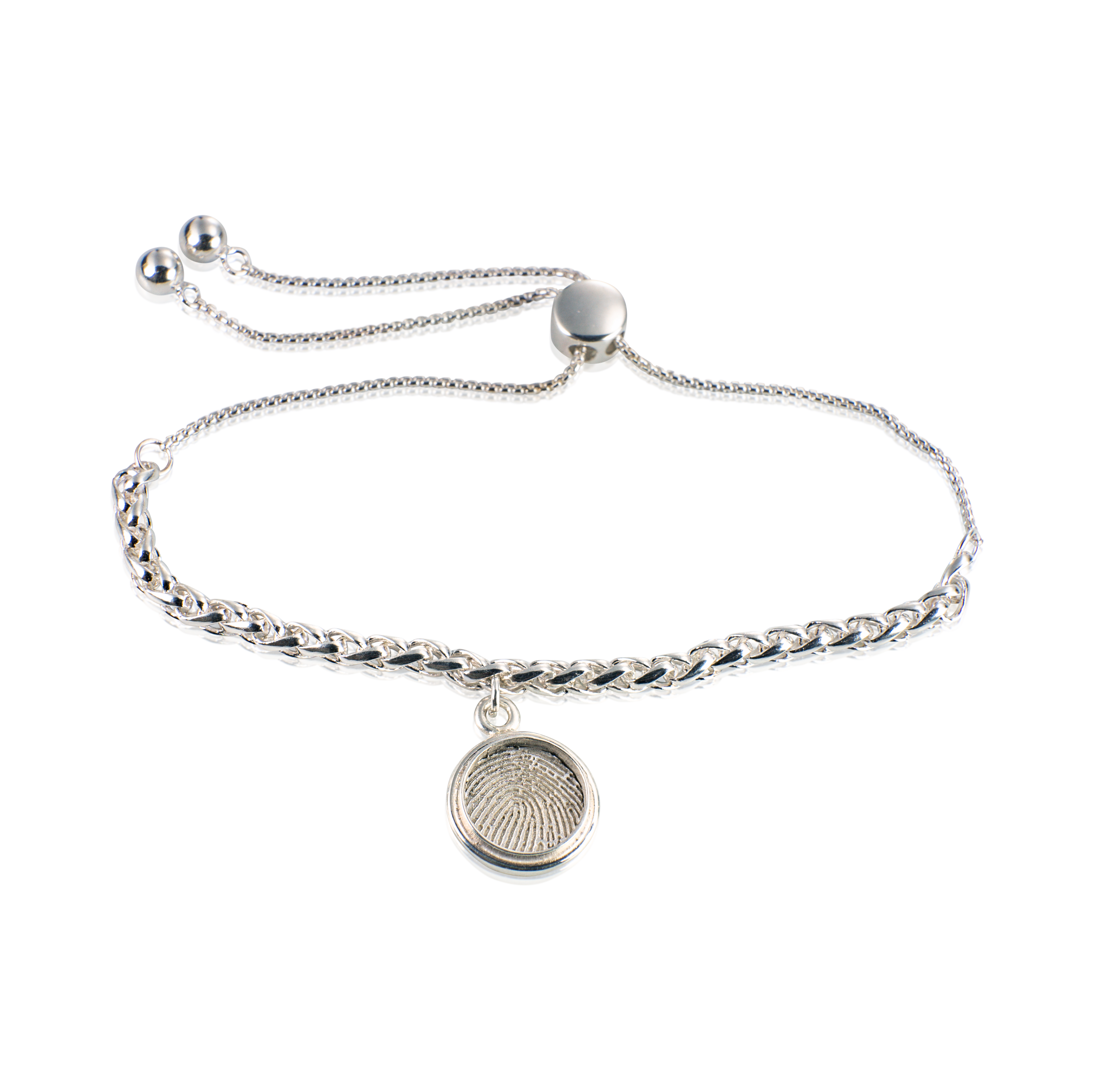 Een lieve herinnering voor iedere dag. Met deze zilveren afdrukarmband draagt u uw meest dierbare persoon altijd bij u. In de ronde bedel graveren wij met een precisielaser een vingerafdruk van uw keuze. Ook het laten graveren van een dierenpootje, handpalm of babyvoetje behoort tot de mogelijkheden. Dat maakt van dit lieflijke zilveren armbandje een uitstekend geboortegeschenk voor nieuwe moeders, een cadeau voor de heilige communie of een aandenken aan een huwelijksdag. Ook als herinneringssieraad aan een overleden dierbare is deze zilveren afdrukarmband zeer geschikt.