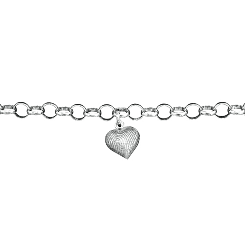 Een prachtig aandenken in de vorm van een elegant sieraad. Deze vingerafdrukarmband bestaat uit een mooie, smalle schakelarmband van zilver met daaraan een hartvormige bedel. Deze hartjesbedel is driedimensionaal uitgewerkt en heeft hierdoor een mooie volle vorm. In deze zilveren bedel graveren wij met uiterste precisie een vingerafdruk, handpalmafdruk, afdruk van een dierenpootje of de afdruk van het voetje van uw baby. Hierdoor wordt deze toch al bijzondere armband een zeer persoonlijk en uniek aandenken aan uw geliefde of dierbare.