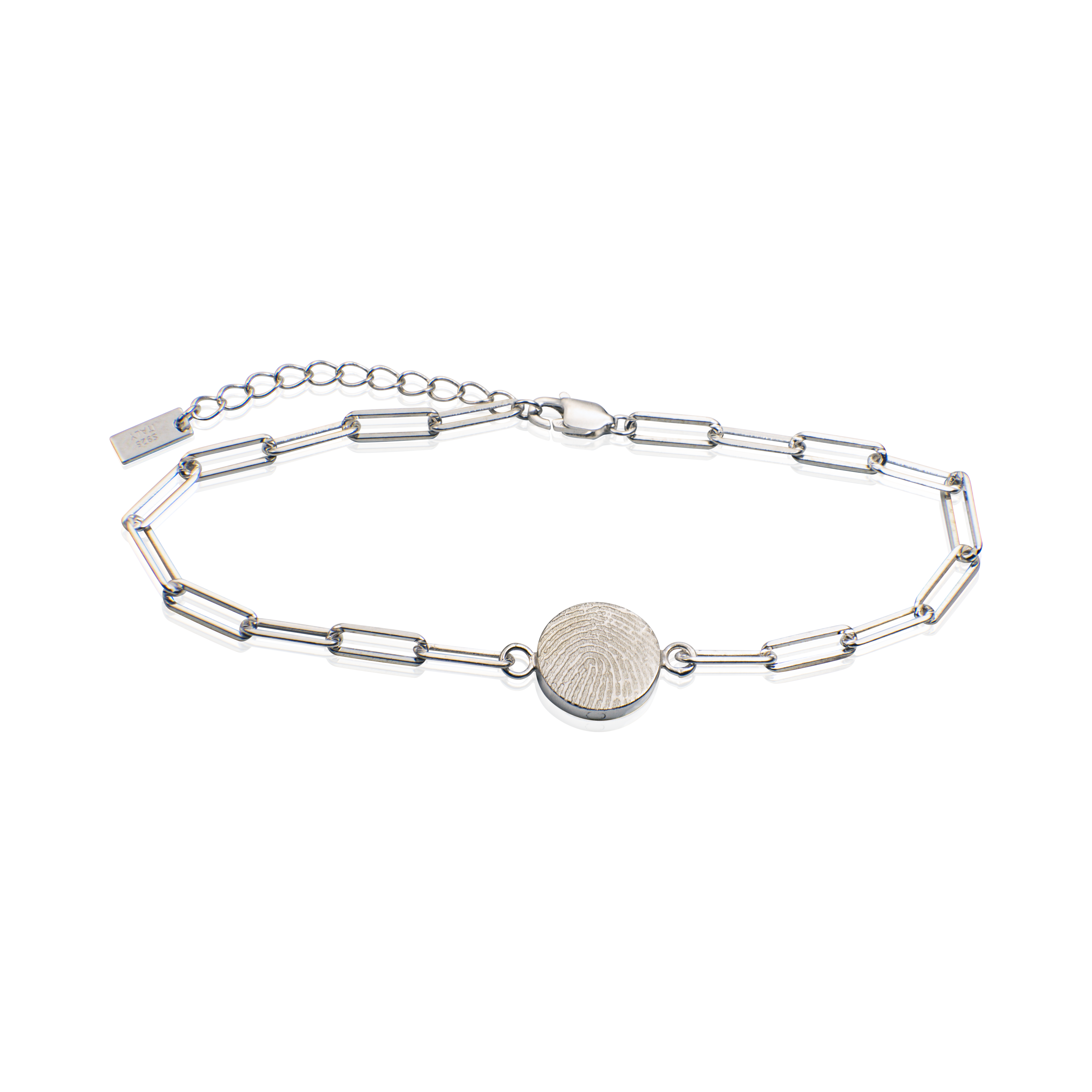 Deze afdruk armband heeft een lengte van 16,5cm en een verstelbaar uiteinde waardoor deze op maximaal 19,5cm gedragen kan worden. De ronde afdrukbedel heeft een afmeting van 11mm. Deze zilveren armband krijgt door het graveren van de afdruk een bijzondere betekenis, als gedenksieraad maar ook als uiting van liefde voor bijvoorbeeld uw partner of kind. Behalve een vingerafdruk is het ook mogelijk een geschaalde afbeelding van een dierenpoot, handpalm of babyhandje of –voetje te laten graveren.