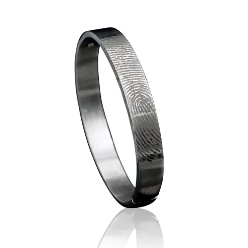 Deze zilveren armband met vingerafdruk vormt een wel heel bijzondere manier om uw liefde uit te drukken. Op de scharnierarmband wordt met een laser een afbeelding van een vingerafdruk, handpalm, dierenpoot of babyhandje of –voetje gegraveerd. Door de toevoeging van de afdruk wordt de armband een blijvende herinnering aan een geliefde of dierbare. De scharnierarmband is verkrijgbaar in 2 maten en sluit met een scharnier en klemslot.