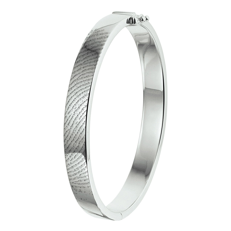 Deze zilveren armband met vingerafdruk vormt een wel heel bijzondere manier om uw liefde uit te drukken. Op de scharnierarmband wordt met een laser een afbeelding van een vingerafdruk, handpalm, dierenpoot of babyhandje of –voetje gegraveerd. Door de toevoeging van de afdruk wordt de armband een blijvende herinnering aan een geliefde of dierbare. De scharnierarmband is verkrijgbaar in 2 maten en sluit met een scharnier en klemslot.