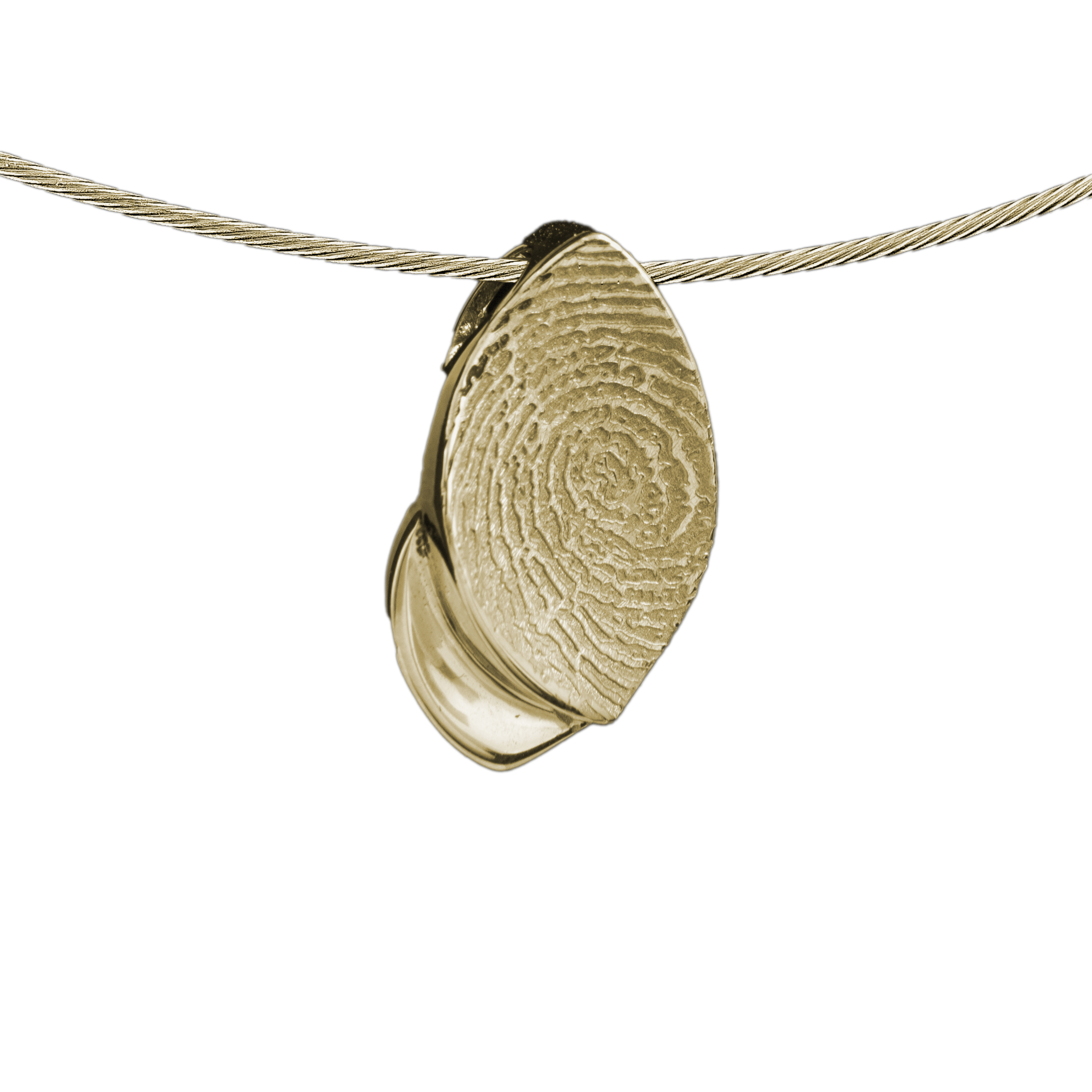Moderne en elegante vingerafdrukhanger van 14k geelgoud. Het verfijnde abstracte design maakt van deze hanger een prachtig subtiel gedenksieraad. Aan de voorzijde wordt door Sieraadgraveren.nl met de grootst mogelijk precisie een vingerafdruk of geschaalde afbeelding van een handpalm, dierenpoot of babyvoetje gegraveerd.