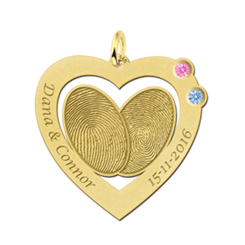 Hartvormige hanger met vingerafdruk en geboortestenen, vervaardigd uit 14 karaats goud. De vingeradruk hanger is 28x28mm groot.