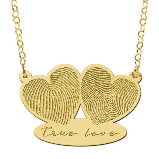 Gouden hanger met twee vingerafdrukken in hartvorm en tekst