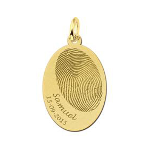 Ovale hanger met vingerafdruk en tekst, vervaardigd uit 14 karaats goud. Deze vingerafdruk hanger is 24,5x16mm groot.