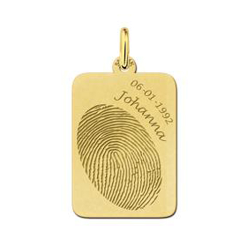 Rechthoekige hanger met vingerafdruk en tekst, vervaardigd uit 14 karaats goud. De afmeting van deze gouden hanger met vingerafdruk is 25,5x15,5mm.
