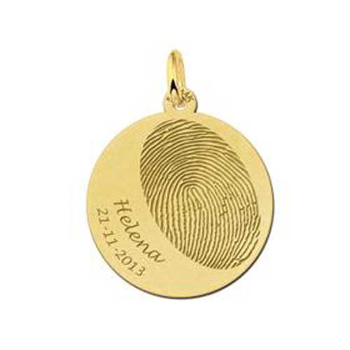 Ronde hanger met vingerafdruk en tekst, vervaardigd uit 14 karaats goud. Deze ronde hanger met vingerafdruk heeft een diameter van 20mm.