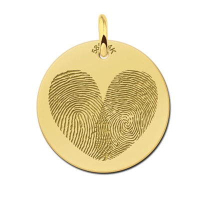 Gouden ronde hanger met twee vingerafdrukken in hartvorm