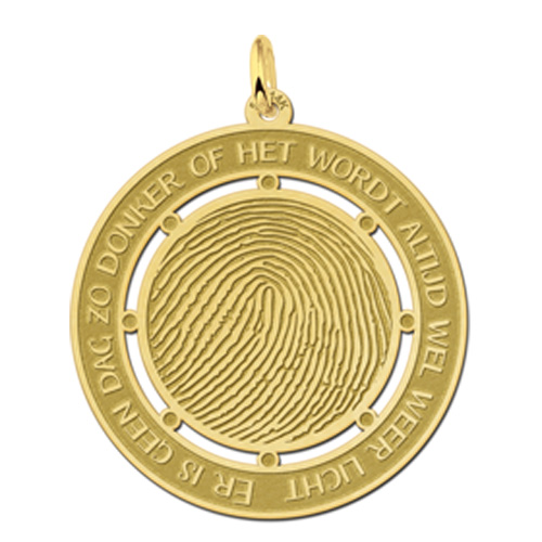 Gouden vingerafdruk sieraad rond met eigen tekst, vervaardigd uit 14 karaats goud in een diameter van 30mm. De tekst graveren wij rondom de vingerafdruk(ken).