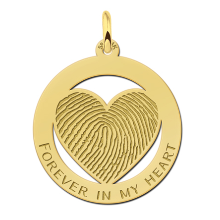 Gouden vingerafdruk sieraad omcirkeld met eigen tekst, vervaardigd uit 14 karaats goud in een diameter van 22,5mm. De dikte van deze hanger is 0,4mm. De tekst graveren wij rondom de vingerafdruk(ken).