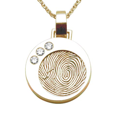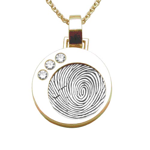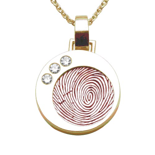 Ronde gouden vingerafdruk hanger van het merk Soulmate Treasure met in de binnenring van de hanger een vingerafdrukplaat en een steen. De hanger heeft een diameter van 15,3mm en is 3mm dik en heeft 3 zirkonia stenen. De vingerafdrukplaat is 11,2mm groot. Het sieraad stelt u zelf samen waarbij u kunt kiezen uit de volgende opties: