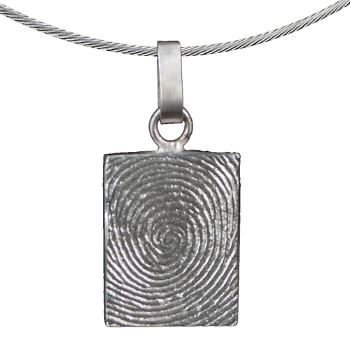 Rechthoekige vingerafdruk hanger van zilver. In de hanger wordt een afdruk verwerkt van uw dierbare. Dit kan een afdruk zijn van een vinger, hand, dierenpoot, babyhandje of babyvoetje. Wij kunnen met alle afdrukken overweg zoals inkt, was, rubber ect. Na het plaatsen van de bestelling ontvangt u de instructies om de afdruk naar ons toe te sturen. Indien gewenst kunt u ook een afdrukset meebestellen welke wij naar u toesturen. Een kleine afdrukset is geschikt voor een vinger. Een grote afdrukset is geschikt voor een handpalm, babyvoetje of dierenpoot.