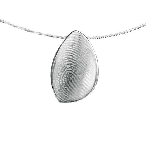 De zilveren vingerafdrukhanger is te verkrijgen in de afmetingen 21mm en 28 mm en kan zowel mat als glanzend worden afgewerkt. De design hanger is zo’n 1,7 millimeter dik.