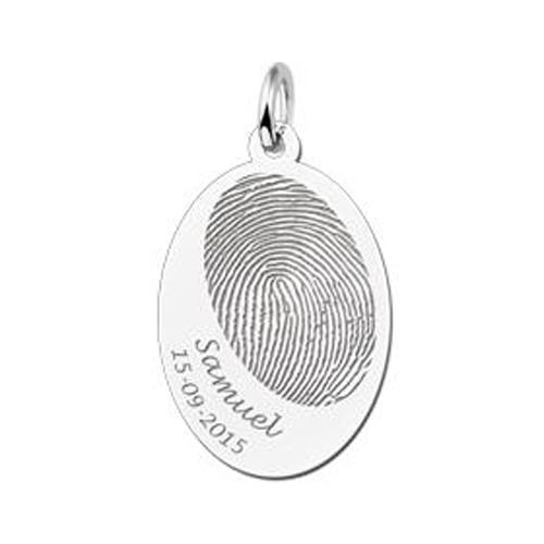 Ovale hanger met vingerafdruk en tekst, vervaardigd uit 925 Zilver. Deze hanger met vingerafdruk heeft de afmeting 24,5x16mm.