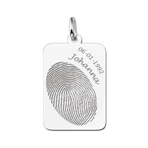 Rechthoekige hanger met vingerafdruk en tekst, vervaardigd uit 925 Zilver. Deze afdrukhanger is 25,5x15,5mm groot.