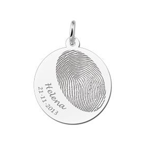 Ronde hanger met vingerafdruk en tekst, vervaardigd uit 925 Zilver. De vingerafdruk hanger heeft een diameter van 20mm.
