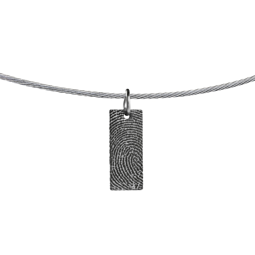 Elegant en toch speels. Het rechthoekige design van deze zilveren hanger met vingerafdruk maakt het sieraad tot een moderne en eigentijdse uiting van liefde en herinnering. In de hanger wordt met grote precisie de vingerafdruk van een geliefde of dierbare gegraveerd. Dat maakt de hanger zeer geschikt als huwelijkscadeau of juist als gedenksieraad voor een overledene. Ook is het mogelijk om een geschaalde afbeelding van een handpalm, dierenpootje of babyhandje of –voetje in de afdrukhanger te laten zetten.