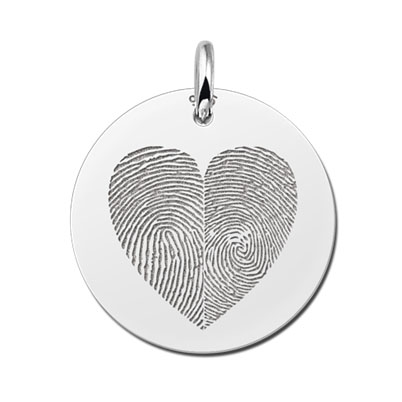 Zilveren ronde hanger met twee vingerafdrukken in een hartvorm
