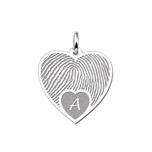 Zilveren vingerafdruk sieraad in de vorm van een hart in het formaat 20x20mm. Onderin het hart is een extra hartje verwerkt waarin een initiaal naar keuze wordt verwerkt.