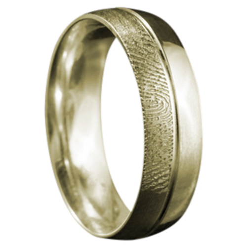 Gouden ring met een door u aangeleverde afdruk. Dit kan een afdruk zijn van een vinger, handpalm, voetje, handje of een dierenpoot. Omdat de vingerafdruk van jonge kinderen erg weinig contouren bevat, is het lastig om duidelijke lijnen op de ring te krijgen. Wij adviseren daarom een afdruk te maken van het voetje of de handpalm/handje.