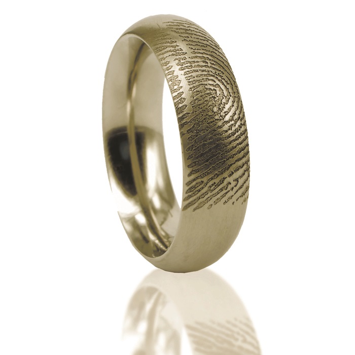 Bolle vingerafdruk ring van 14 karaats goud met een lasergravure van de door u aangeleverde afdruk. Dit kan een afdruk zijn van een vinger, handpalm, dierenpoot, babyvoetje of babyhandje.