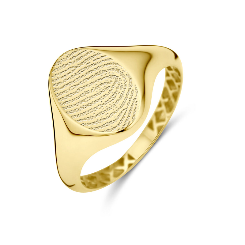 In deze 14k gouden ovale vingerafdrukring wordt de afdruk van uw geliefde, een kind, een huisdier of een overleden dierbare gegraveerd.