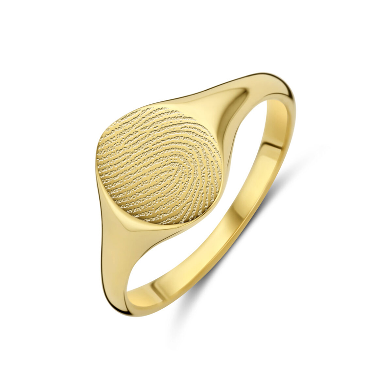 In deze ovale14k gouden vingerafdrukring wordt de afdruk van uw geliefde, een kind, een huisdier of een overleden dierbare gegraveerd. In de binnenzijde van de ring is er tevens ruimte voor het graveren van een persoonlijke tekst. Dit kan een naam, datum of bijzondere uitspraak zijn.
