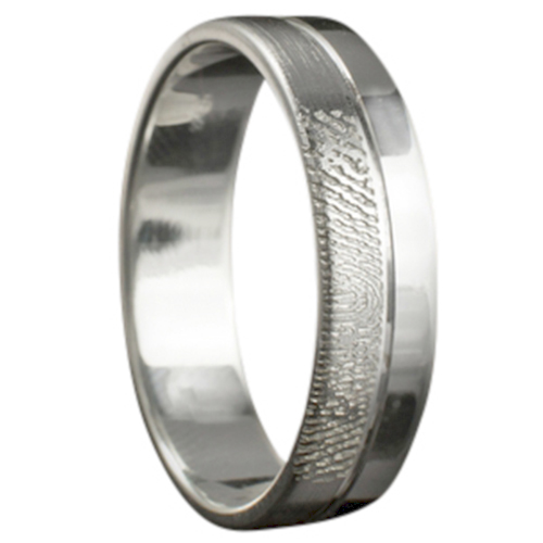 Zilveren ring met een door u aangeleverde afdruk. Dit kan een afdruk zijn van een vinger, handpalm, voetje, handje of een dierenpoot. Omdat de vingerafdruk van jonge kinderen erg weinig contouren bevat, is het lastig om duidelijke lijnen op de ring te krijgen. Wij adviseren daarom een afdruk te maken van het voetje of de handpalm/handje.