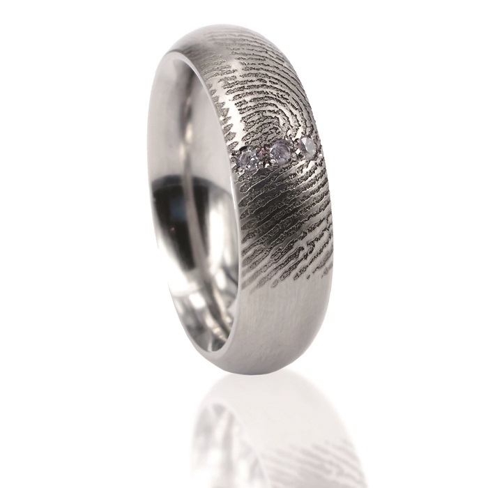 Bolle vingerafdruk ring van 925 zilver met drie stenen naar keuze en een lasergravure van de door u aangeleverde afdruk. Dit kan een afdruk zijn van een vinger, handpalm, voetje, handje of een dierenpoot. Omdat de vingerafdruk van jonge kinderen erg weinig contouren bevat, is het lastig om duidelijke lijnen op het sieraad te krijgen. Wij adviseren daarom een afdruk te maken van het voetje of de handpalm/handje.