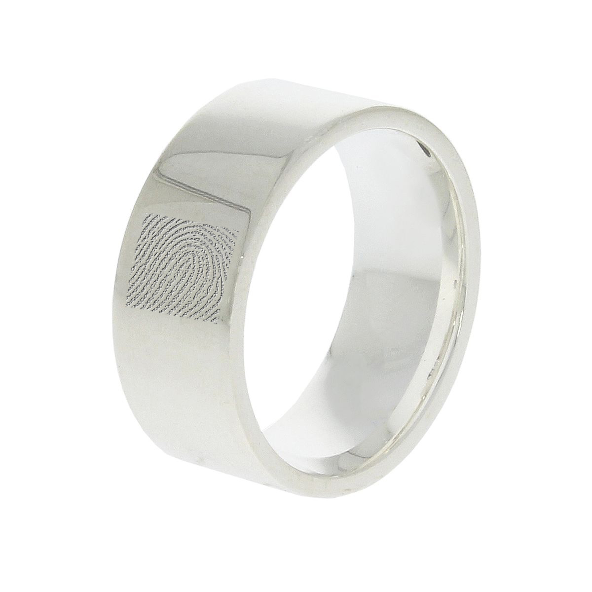 Deze zilveren ring met vingerafdruk is verkrijgbaar in ringmaat 16mm tot en met 21mm en is 8mm breed.