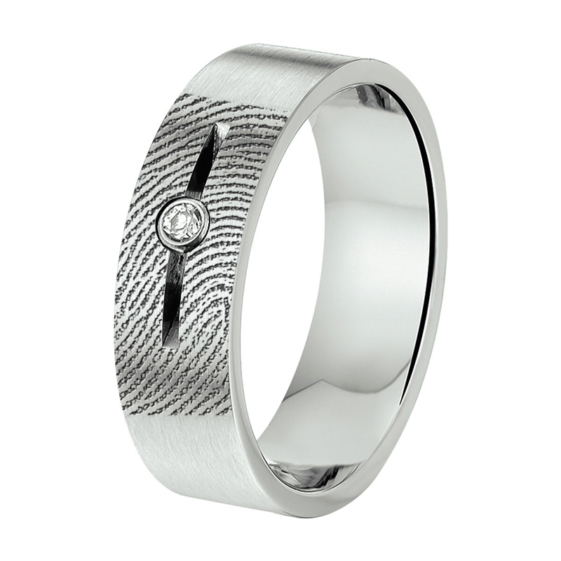 Deze prachtige edelstalen afdrukring is een uniek en persoonlijk sieraad, speciaal ontworpen voor het vieren van de liefde of als tastbare herinnering van een dierbare of huisdier.  De afdruk kan een vingerafdruk, babyhandje of  -voetje of een dierenpoot zijn. De afdruk wordt met uiterste precisie gegraveerd in de ring, wat elk exemplaar uniek maakt! Bovendien wordt deze ring voorzien van een prachtige steen doormiddel van een klemzetting.