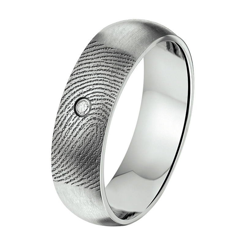 Vingerafdruk ring van RVS met een prachtige zirkonia steen. De vingerafdruk van uw dierbare wordt in de ring verwerkt. Het is mogelijk om een afdruk van een vinger, handpalm, voetje, handje of een dierenpoot in de ring te verwerken. Omdat de vingerafdruk van jonge kinderen erg weinig contouren bevat, is het lastig om duidelijke lijnen op het sieraad te krijgen. Wij adviseren daarom een afdruk te maken van het voetje of de handpalm/handje.